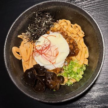 A flavorful twist on ramen without broth. Springy noodles tossed in savory house-made sauce, layered with braised chopped pork, scallions, menma, blackear mushroom, nori, and an onsen egg. Mix well before eating—the sauce coats every noodle for a rich, satisfying bite that’s lighter yet packed with flavor.