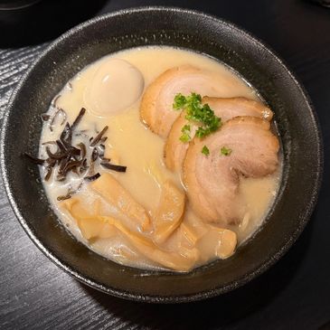 A bold and aromatic take on tonkotsu ramen, enriched with our house-made black garlic oil for deep, smoky-sweet umami. Silky pork broth pairs with tender chashu, seasoned egg, kikurage mushrooms, scallion, and nori, creating a rich and satisfying bowl with layers of flavor in every sip